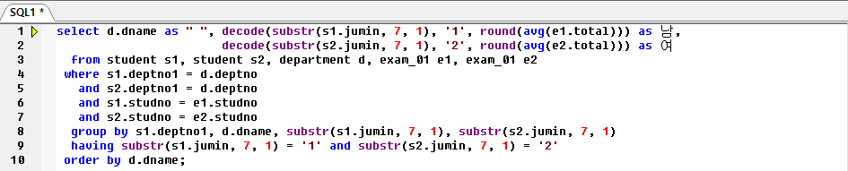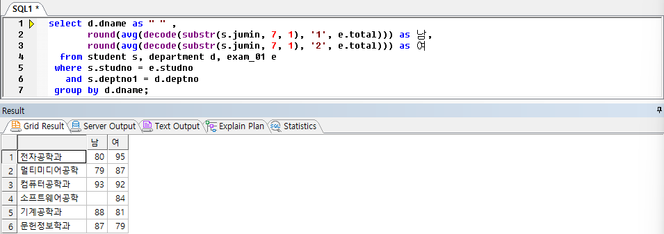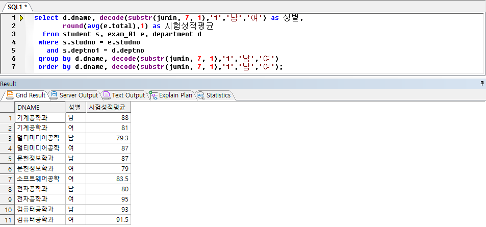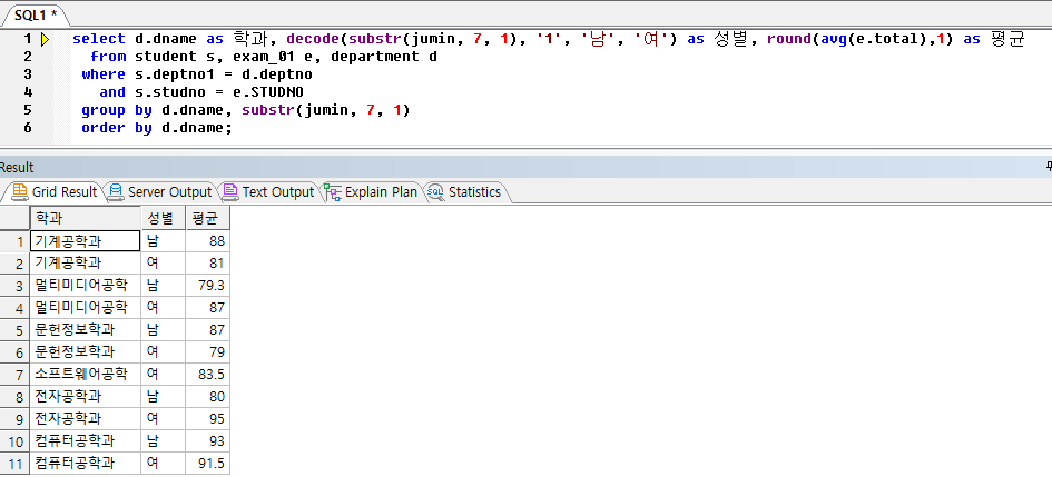 실습문제 3. student, exam_01, department 테이블을 사용하여 학과별, 성별 시험성적의 평균을 출력하여라(학과는 제1전공으로 할 것)