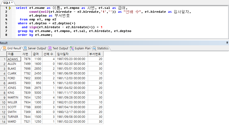 결론적으로는 답은 맞게 나왔는데 선생님은 그냥 바로 날짜 비교를 하셨다. 사원보다 사수 날짜가 더 오래되었기 때문에 사원 날짜가 클 때 카운트를 하도록 하였다.