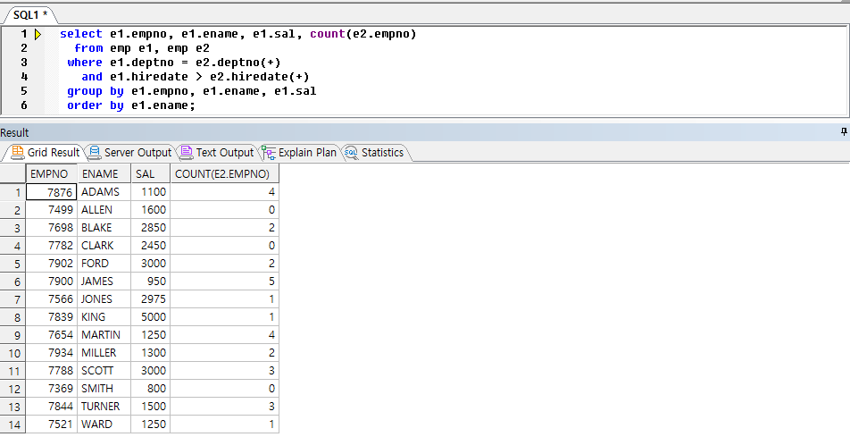 실습문제 1. emp 테이블에서 각 직원의 이름, 사번, 급여와 함께 각 직원의 같은 부서에 있는 선배(입사일이 빠른) 수를 출력하여라. 단, 선배가 없더라도 출력이 되어야 한다.