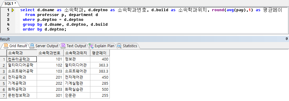 실습문제 4. professor, department 테이블을 사용하여 각 교수의 소속학과별로 소속교수의 pay의 평균을 구하되, 소속학과명, 소속학과번호, 소속학과 위치와 함께 출력하여라.