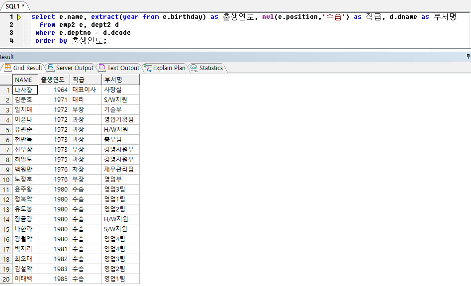 실습문제 2. emp2, dept2 테이블을 사용하여 각 직원의 이름, 출생연도, 직급(position), 부서명을 출력하여라. 단, 직급이 없는 직원은 수습으로 출력한다.