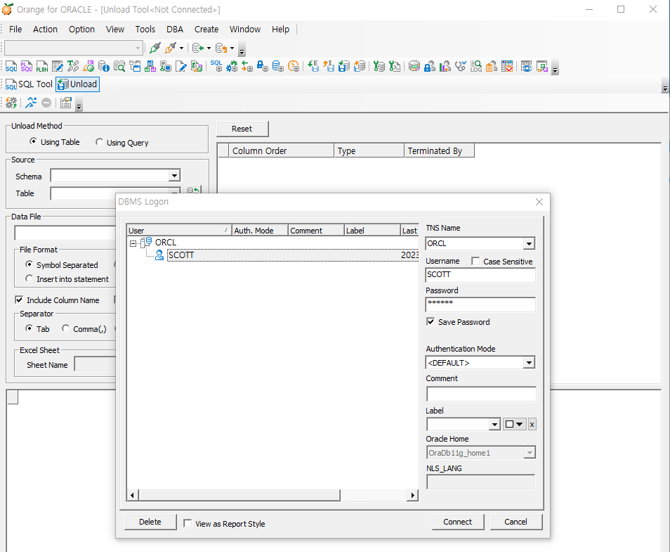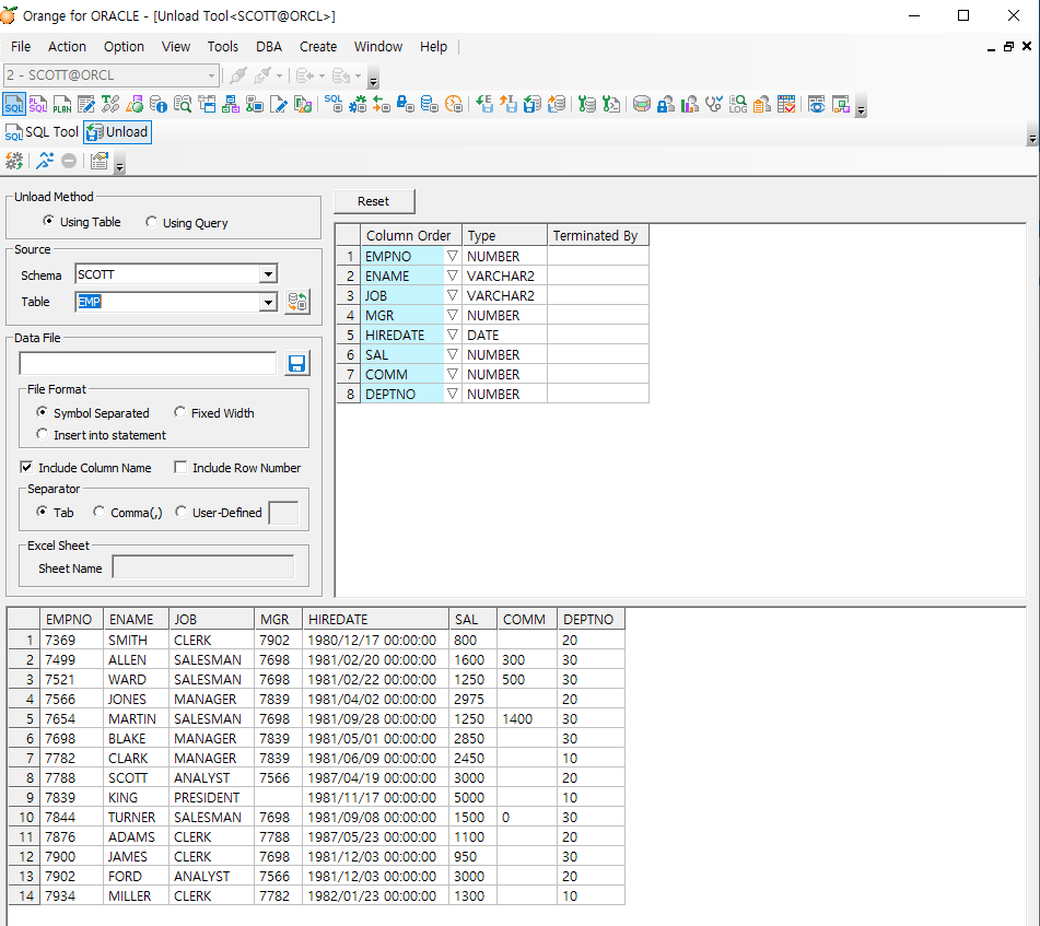 unload 하고자 하는 테이블을 선택하면 아래와 같이 뜬다(emp 선택)